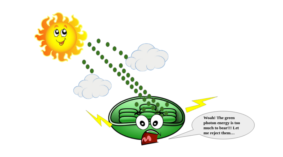 Green light however, has a higher energy associated with it, while red and blue lights have lower amounts of energy. So why should plants waste the powerful green photons, and go for the less energized red and blue ones? To understand this, let us imagine the chlorophyll molecule to be a device that needs electricity to function, but lacks an in-built fuse system to protect it from short-circuits and high current load. The photons from the Sun are the source of electricity for the chlorophylls in our example. The photon supply process from the Sun to the plants is sometimes disturbed by obstacles like clouds that prevent sunlight from reaching the plants. Plants frequently experience such moments of shade where their photon supply is cut. Since plants cannot move, they cannot follow sunlight throughout. In such a situation, if they opt to take in green photons, it would resemble huge amounts of current supply reaching the chlorophylls after short periods of pause in the flow. This would lead to frequent short circuits in the chlorophyll devices as they lack fuses. These frequent disturbances can eventually destroy the photosynthetic machinery and threaten the survival of plants! Hence plants have beautiful risk-sensing molecules called ‘chromophores’ within chlorophylls, which help them avoid the green photons, make food and survive on the long term.