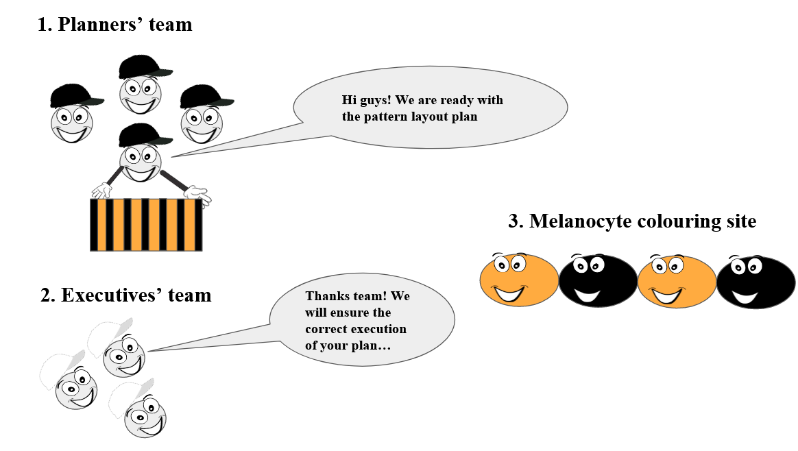 First let us look at the skin colours of a tiger. Have you ever wondered what is the reason for the tiger stripes being differently coloured from their skin? Well, the answer lies in a colour-giving pigment called melanin produced by cells called melanocytes. Tiger stripes are made of cells producing a kind of melanin called ‘Eumelanin’, that appears black. The orange and yellow tinted skin appears so because of a pigment called ‘Pheomelanin’. But how do these cells know where to paint the pigments and produce the stripe pattern? Do they have secret guides to solve this puzzle? Yes! These helpers are called genes! A group of genes called ‘planner genes’ prepare a layout plan for placing the melanocytes in their respective places. These stripe patterns are planned and created even before the tiger is born. Another bunch of genes called ‘executive genes’ supervise the melanocytes and ensure if they follow the layout blueprint and produce the correct pigment. These tiny workers together cause the bright orange-black pattern to appear on the tigers. Do you also know that these stripe patterns are unique to a tiger? This is similar to the uniqueness of fingerprints in humans.