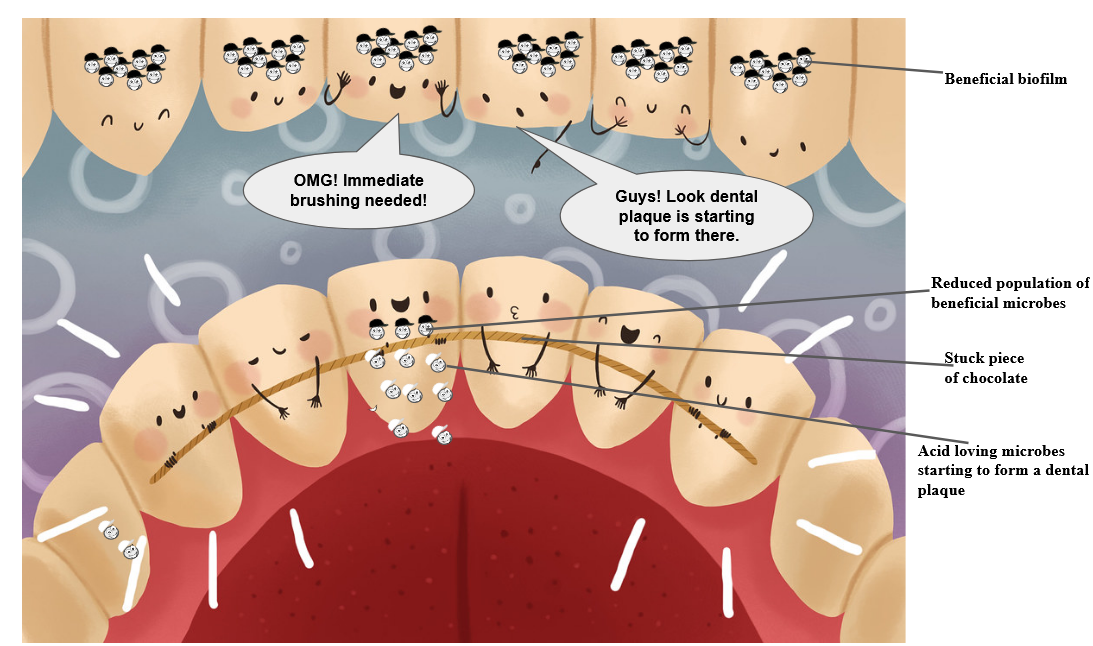So far peace and harmony prevail in the tooth biofilm community. But the moment, say a chunk of sweet like chocolate is bitten, bits of chocolate stick to the teeth. Now the microbes are in for a sugary treat! They digest the sugar molecules, convert them into acids and release them into the matrix. This acid signal attracts more acid-loving bacteria to the site. The new guests also feed on the sugar and produce more acids. The peaceful biofilm made of beneficial microbes gets disrupted and acid-loving microbes start to dominate, forming what is called a ‘dental plaque’. The benefical microbes are present in minority in such dental plaques and the acid-producers comprise the majority. These acid producers secrete acids that are corrosive enough to form holes on the tooth enamel! These holes are scientifically called ‘cavities’. The dental cavities are thus caused by an imbalance of the microbes in the teeth biofilm. Brushing removes food particles like chocolate, other carbs and sugars stuck to the teeth. It also physically disrupts the biofilm matrix after which only the regular residents or beneficial microbes re-group to form the protective biofilm.